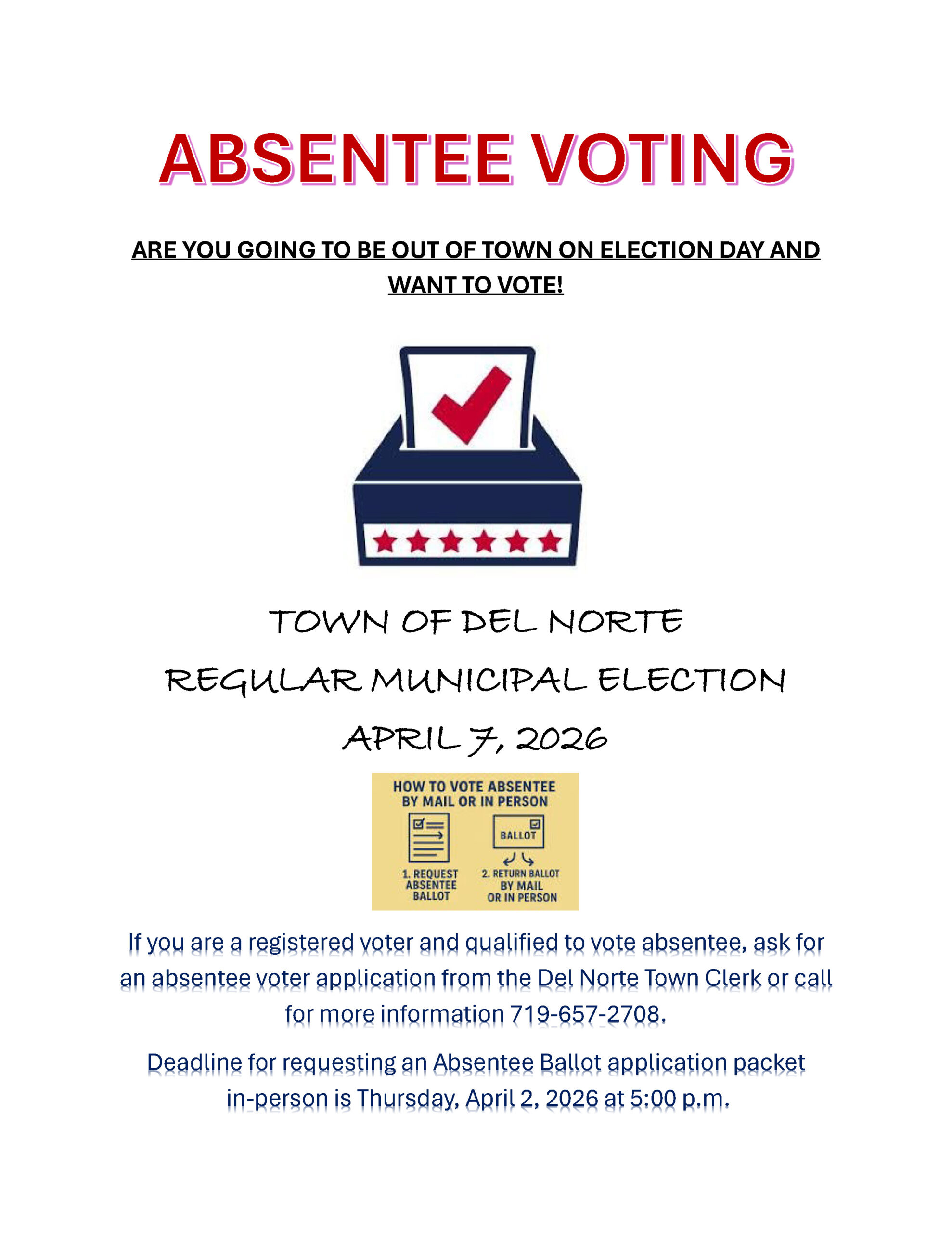 2026 Town Elections Absentee Voting: Are You Going to be Out of Town on Election Day? The deadline for requesting an absentee ballot packet is Thursday April 2 at 5pm at Town Hall.